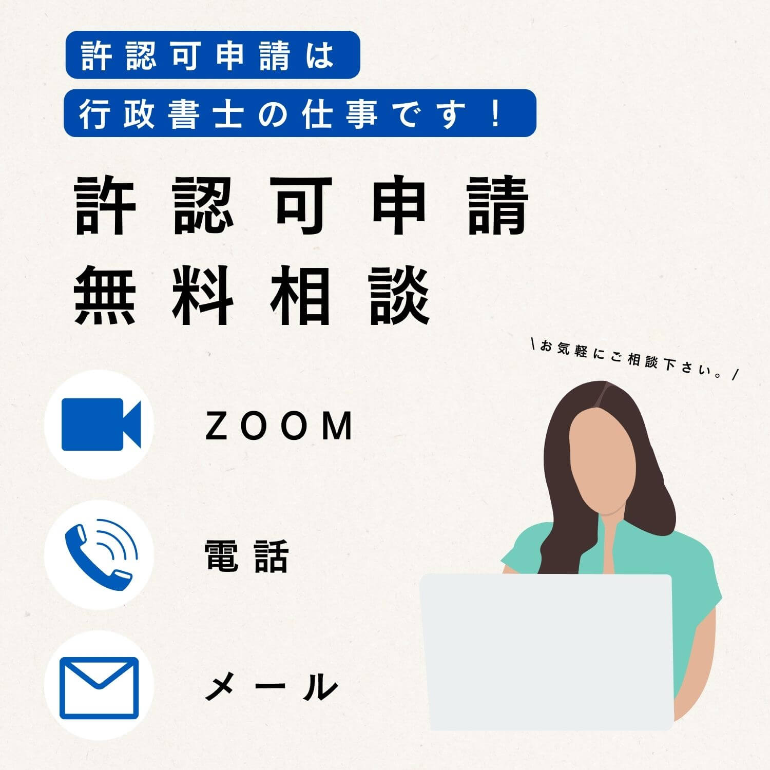 そんなお悩みの方に、高い専門性と幅広い法律知識で親切・丁寧にお手伝いさせていただきます。お客様とのやりとりはオンライン又は出張対応。必要書類の受渡しはパソコンで。お客様は事務所に来られる必要はありません。